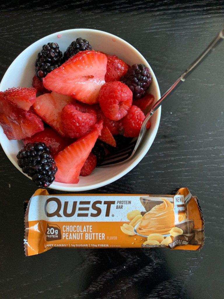 - I usually need a mid afternoon snack to get me through my after school activities- Quest Bars and fruit are always at hand. Quest bars are FULL of protein with minimal sugar and fruit gives the sweet taste that I crave.