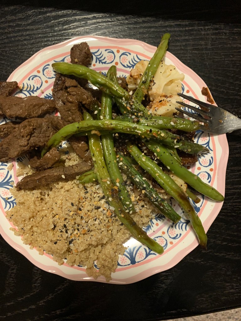 - Dinners I also make in advance. I love roasting veggies, I’ve been really into steak strips, and adding quinoa for a source of energy!