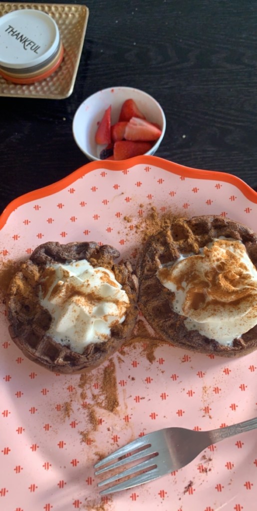 - For breakfasts, I love hot oatmeal with almond butter, cinnamon and apple slices if I have them. Sometimes, if I wake up with a sweet tooth (I know I’m not alone!!) I’ll make waffles with whipped cream and berries!