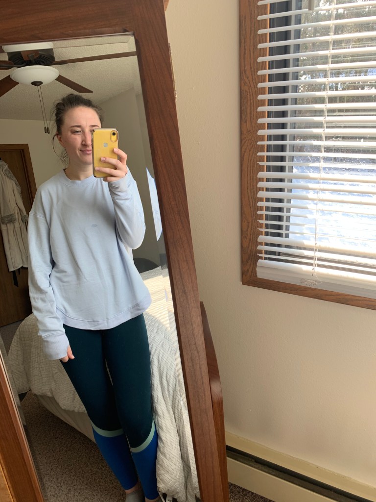 - Again, I solely buy workout clothes on sale! I recently stalked the Target sale rack and found this blue, Target, long sleeve on sale! It’s so soft and cozy!